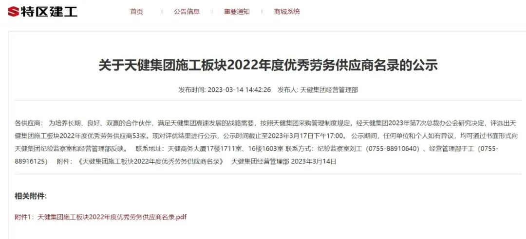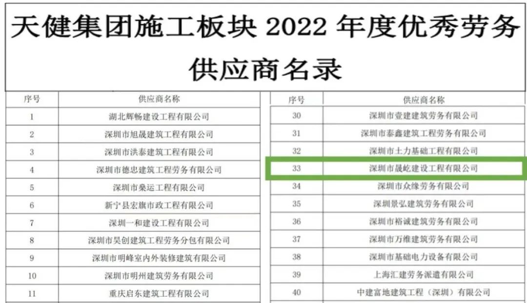 日前,經天健集團2023年第7次總裁辦公會研究決定,評選出天健集團施工版塊2022年度優秀勞務供應商。深圳市晟屹建設工程有限公司憑借出色的業務水平、優秀的品質服務,被授予“2022年度優秀勞務供應商”殊榮。