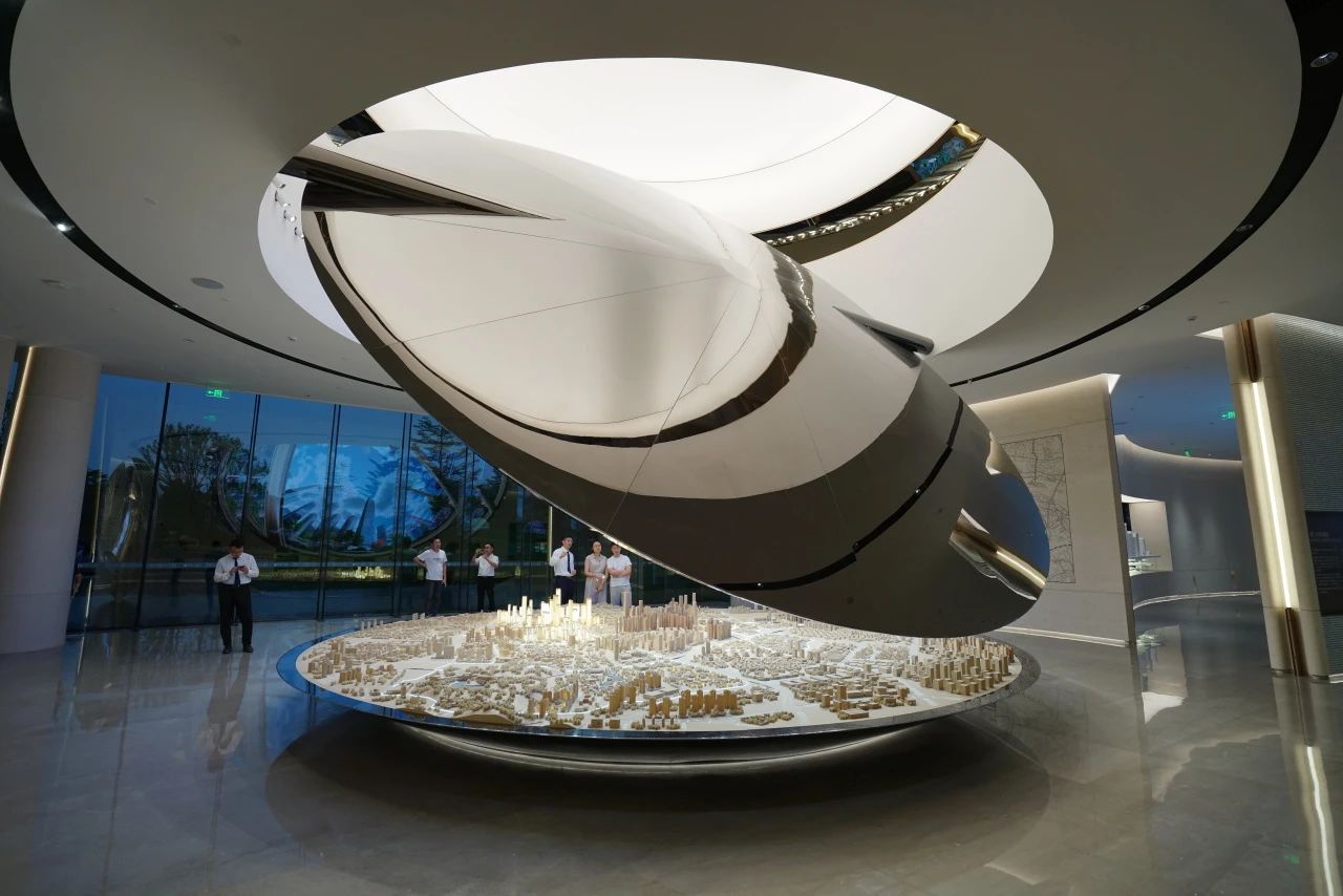 同時也設有精心設計的圖文展示墻,詳細記錄了長隆萬博片區的發展歷程和未來規劃,從萬博片區到項目自身,層層遞進,即使非廣州本地人也能迅速了解板塊情況。從一樓,可以清晰看到番禺的發展,看到萬博CBD從1.0到3.0的一路進化與迭代。從2006年萬博商務區概念面世,再到2013年控規獲批,直至2023年完成擴容。擴容后的萬博商務區,由1.5平方公里擴展至7.2平方公里,涵蓋漢溪長隆、萬博、里仁洞三大板塊,并統稱為“廣州南CBD”。360°沉浸式影廳,給大家描繪萬博未來城市的生活方式。