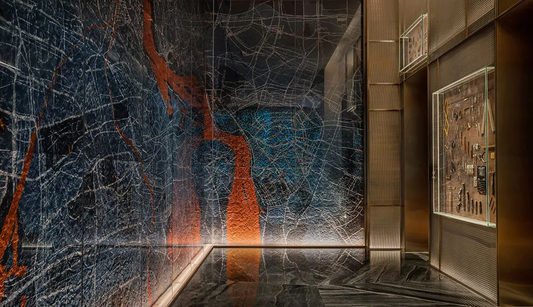 總臺后一叢叢青金石粗糲生長,光河在棱角中沖撞,仿若繪制中的梵高星空,靜謐燃燒宇宙的弦。平滑如鏡的大理石地面,不動聲色地照映萬物,模糊了虛實界限。