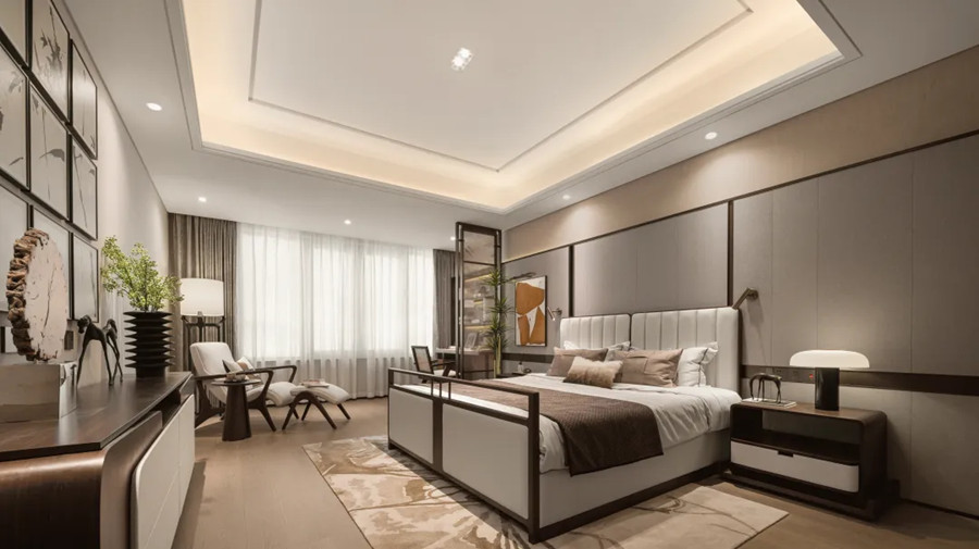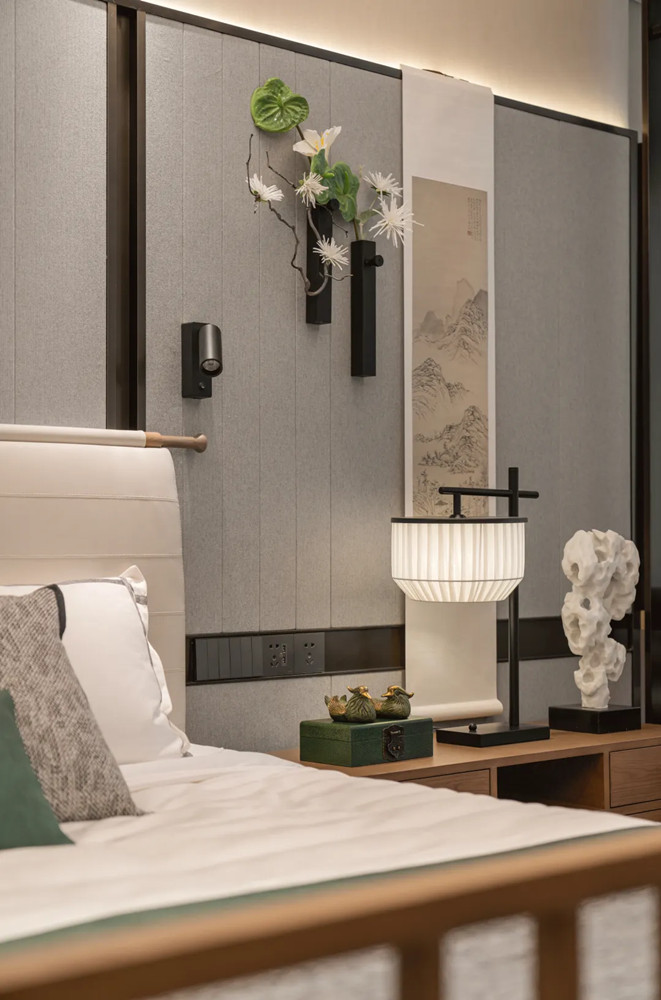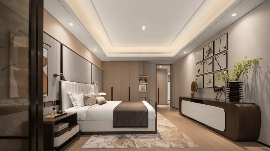 老人的睡眠空間傳承了從建筑中來(lái)的中式留白意境,雅致沉穩(wěn)的棕調(diào)構(gòu)建出具有東方氣質(zhì)的禪意之所,適度留白傳遞長(zhǎng)者淡雅從容的生活品味,在飽滿的間距式照明光影的交織中,勾畫(huà)出一間具有多重維度體驗(yàn)的就寢空間。