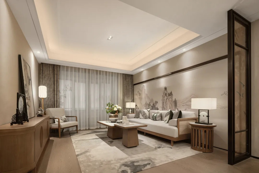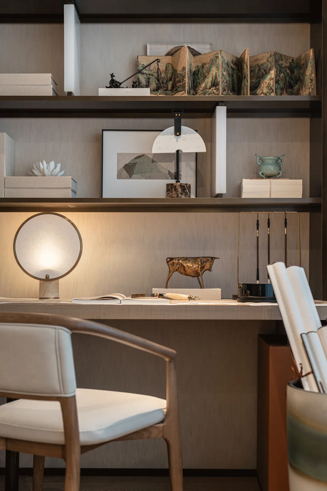 一體式的設(shè)計(jì)令空間顯得大氣而舒展,客廳是家的社交地點(diǎn),也是景之所在??臻g以南京意境為主題,追敘過(guò)往時(shí)光。