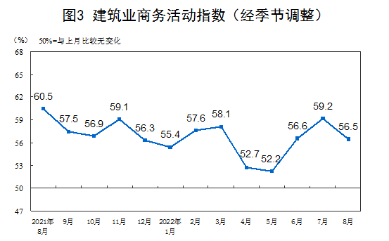 分行業看,建筑業商務活動指數為56.5%,比上月下降2.7個百分點。服務業商務活動指數為51.9%,比上月下降0.9個百分點。從行業情況看,住宿、餐飲、電信廣播電視及衛星傳輸服務、貨幣金融服務等行業商務活動指數位于55.0%以上較高景氣區間;房地產、租賃及商務服務、居民服務等行業商務活動指數低于臨界點。