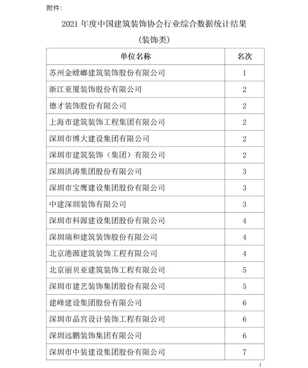 根據中裝協《關于開展2021年度中國建筑裝飾協會行業綜合數據統計工作的通知》(中裝協 [2022]24號文件)及文件中所確定的工作原則和統計規則, 中國建筑裝飾協會組織開展了2021年度中國建筑裝飾行業綜合數據統計工作,此次綜合數據統計工作分為裝飾、幕墻、設計、建材四類,現將2021年度中國建筑裝飾協會行業綜合數據統計裝飾類結果名單予以公示,公示期7天。