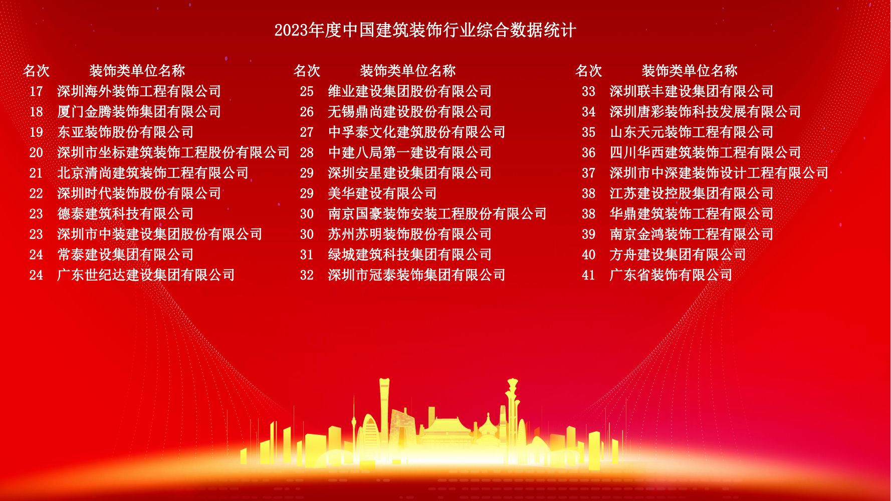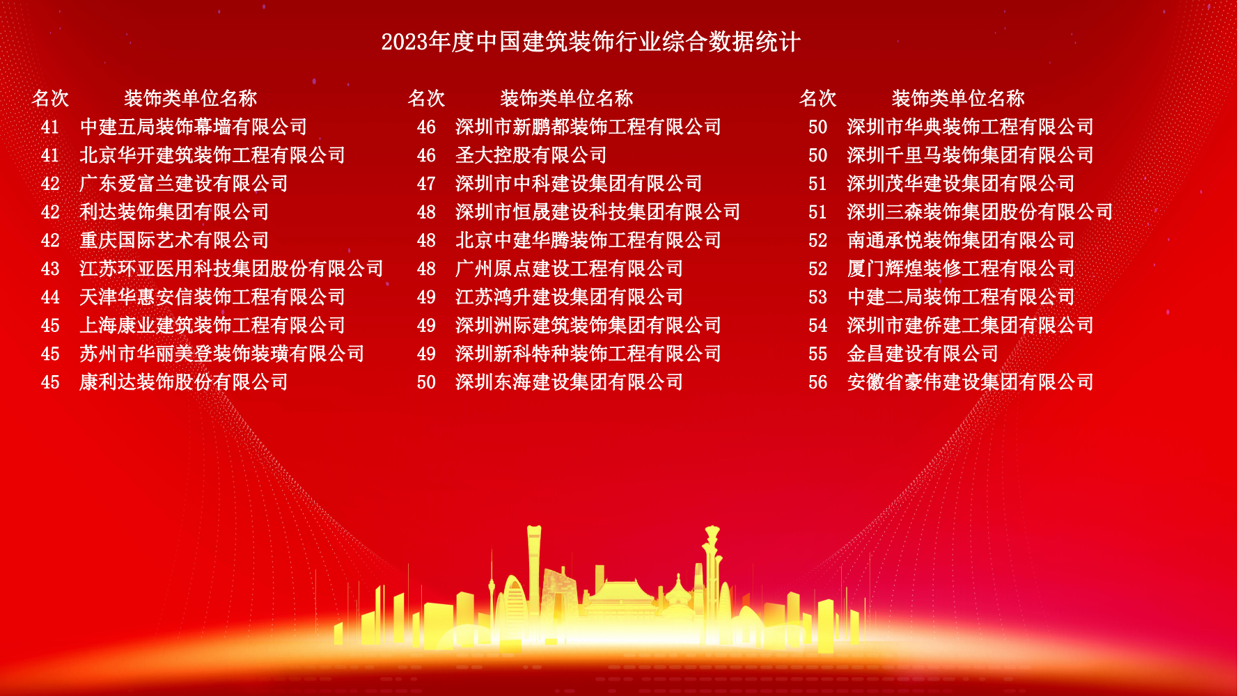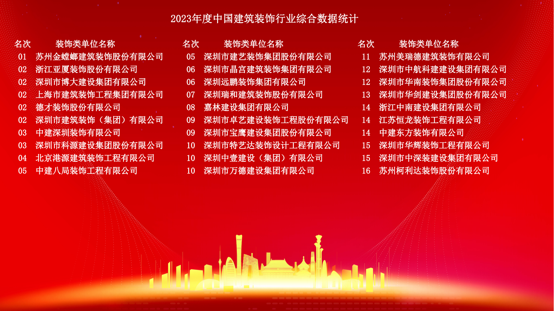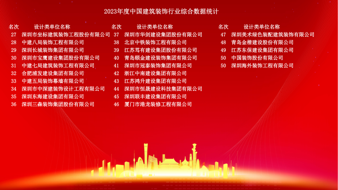 12月10日,2023年度中國建筑裝飾協會行業綜合數據統計正式發布。詳細名單如下: